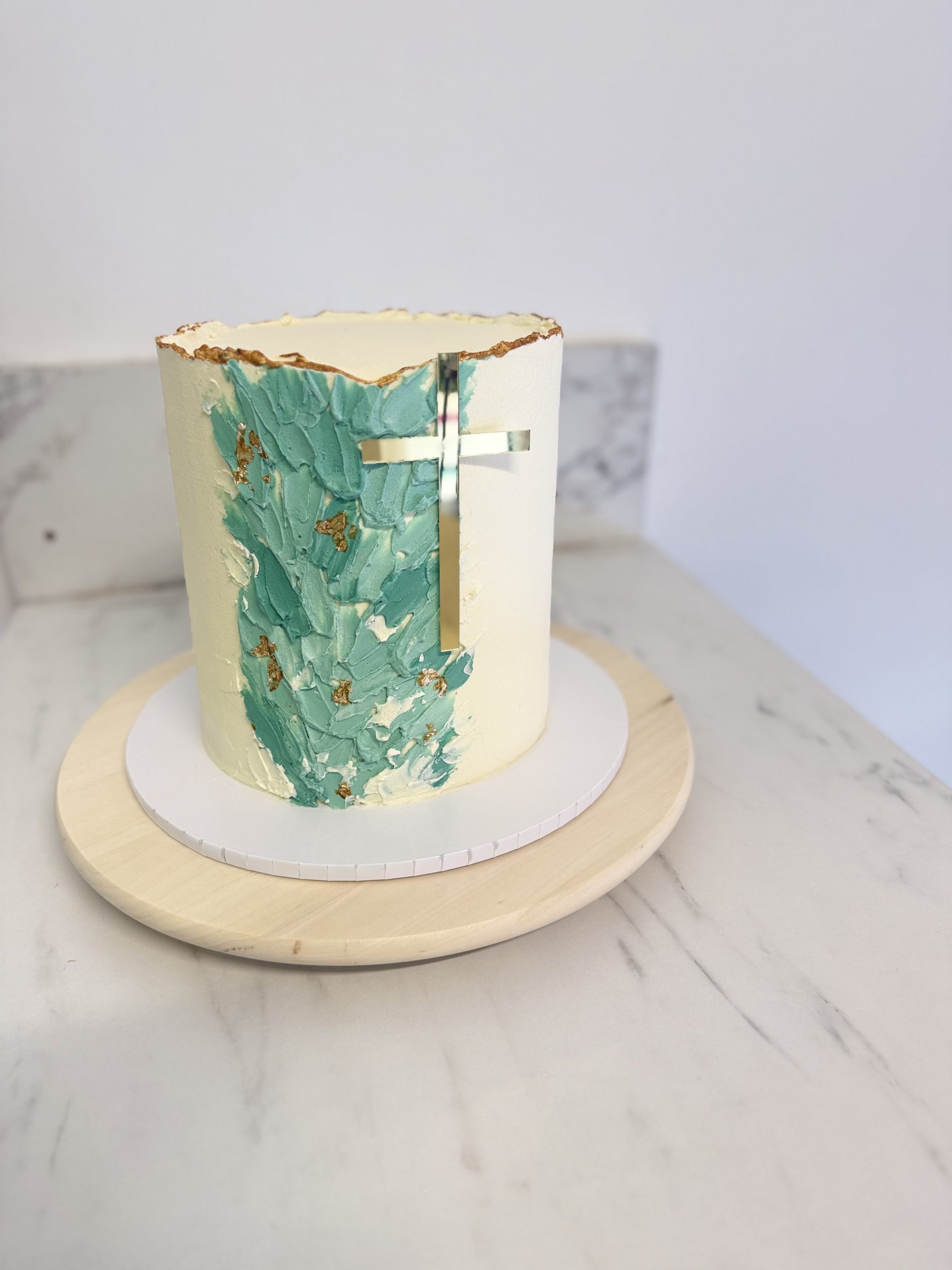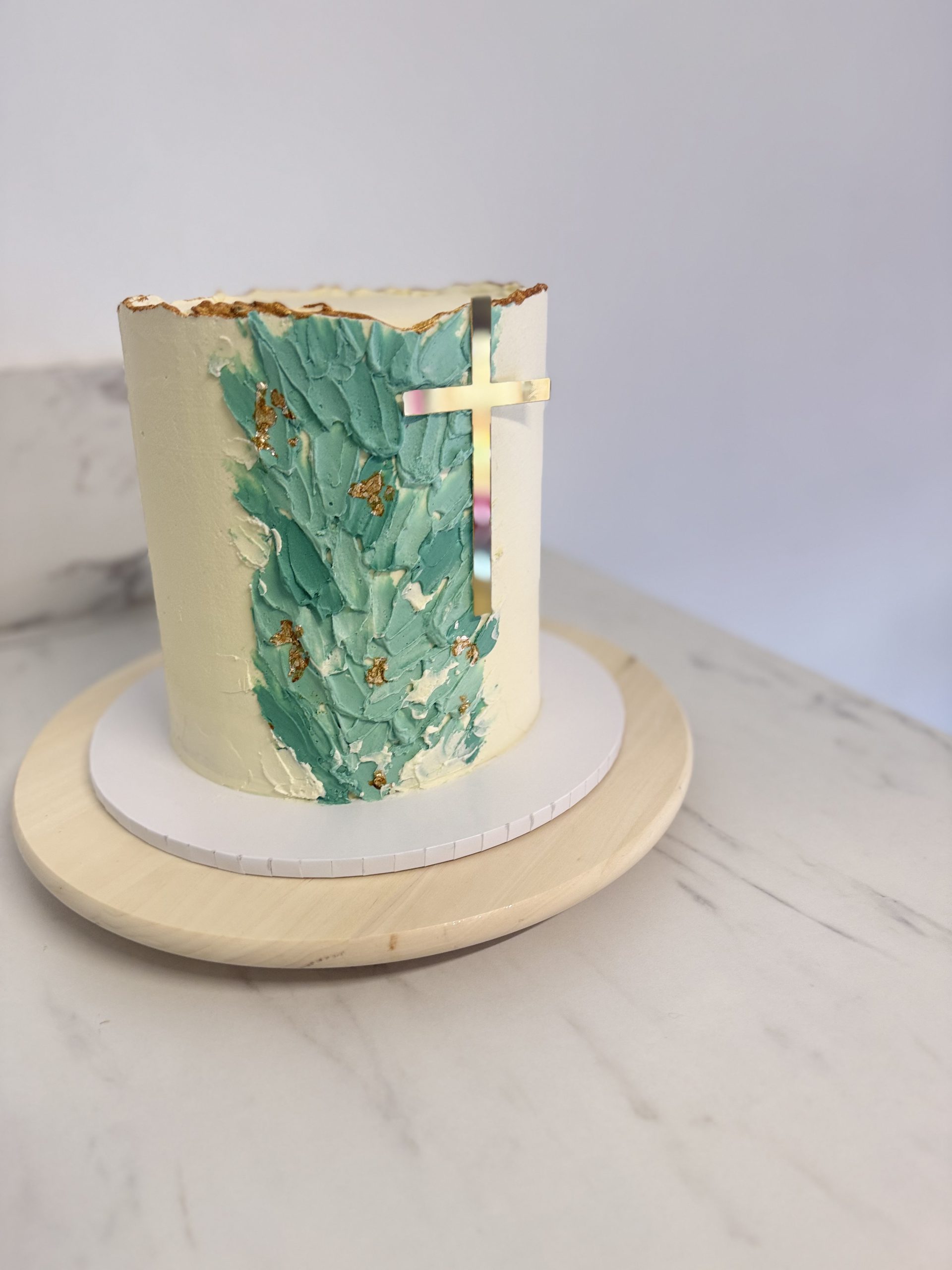 Mark your child’s Christening, Baptism, or First Holy Communion with this beautifully modern and elegant single-tier cake. Our Textured Teal & Gold Cross Cake is designed to be a peaceful and sophisticated centrepiece for a sacred celebration.