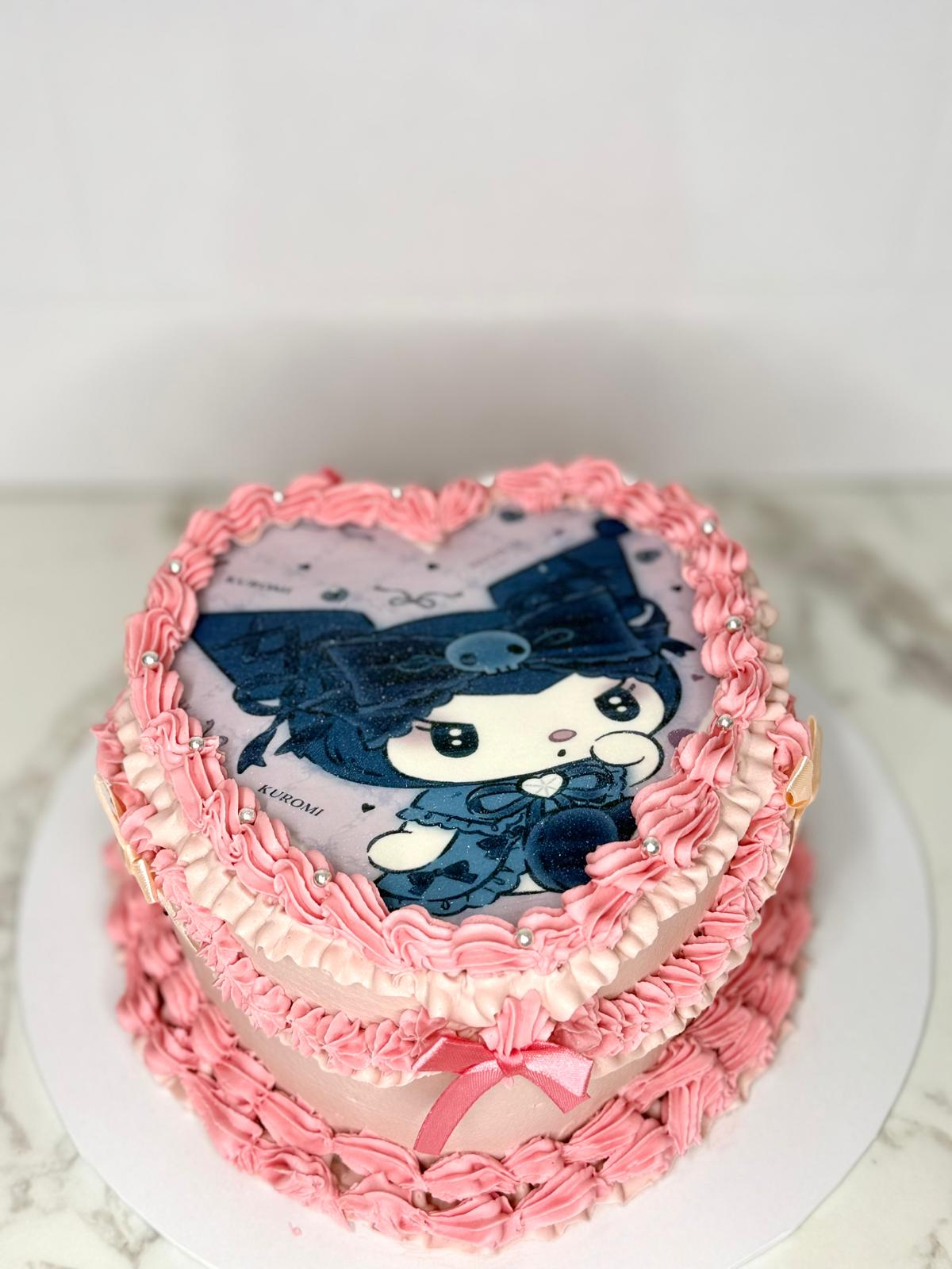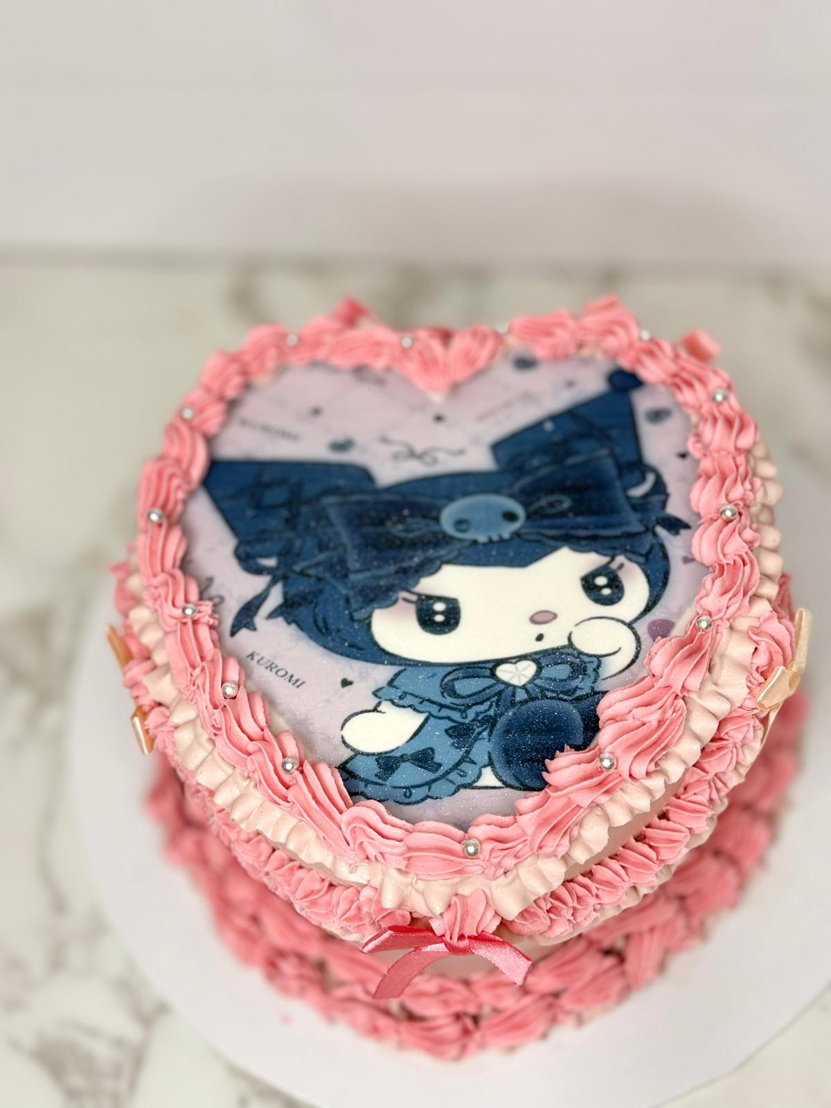 Celebrate with a touch of gothic glam! This adorable yet sassy Kuromi themed heart-shaped cake is perfect for fans of Sanrio’s mischief-maker. Featuring an edible image of Kuromi surrounded by beautiful pink ruffles and pearls, this cake is ideal for birthdays, Valentine’s Day, or any occasion needing an edge of cute rebellion.