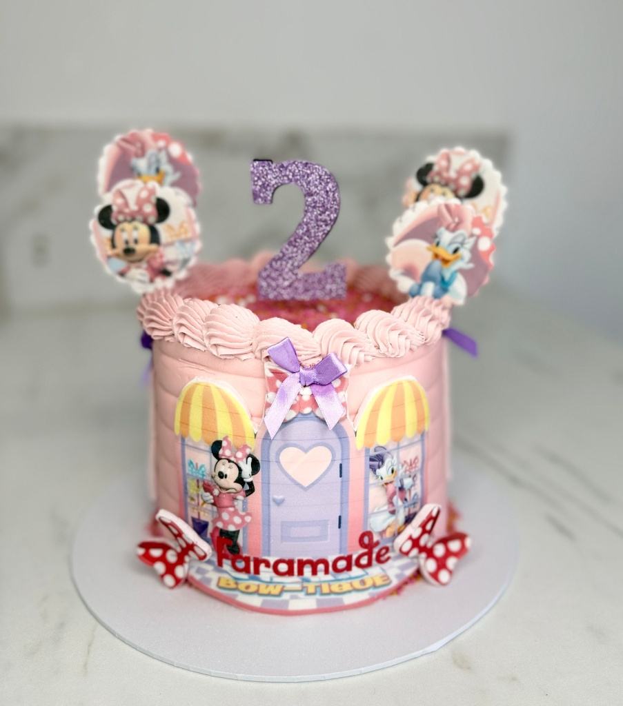 - Minnie’s Bow-Tique Theme: The cake is designed to look like Minnie’s shop, complete with awnings, a heart-detailed door, and the “Fara-made Bow-Tique” logo (customizable with your child’s name).