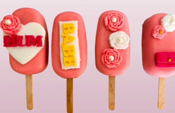 Show your love with these sweet and beautiful Personalized Cakesicles! Dipped in a rich pink coating and decorated with romantic elements like fondant roses, hearts, and custom message banners (e.g., MUM, BABE), these are the perfect heartfelt treats for Mother’s Day, Valentine’s Day, or just to say “I love you.”
