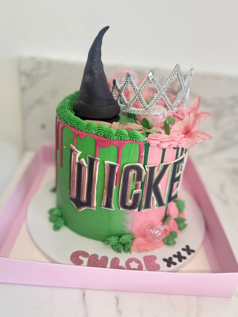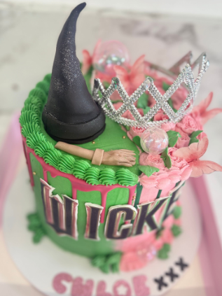 Bring the magic of the Emerald City and the Pink Bubble to your celebration with this spectacular Wicked Musical-themed cake! Featuring the iconic green and pink colour scheme, this cake is the perfect centerpiece for theatre lovers, Broadway fans, and anyone who believes in defying gravity.